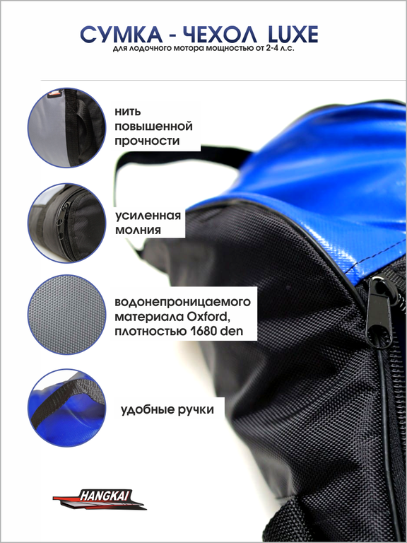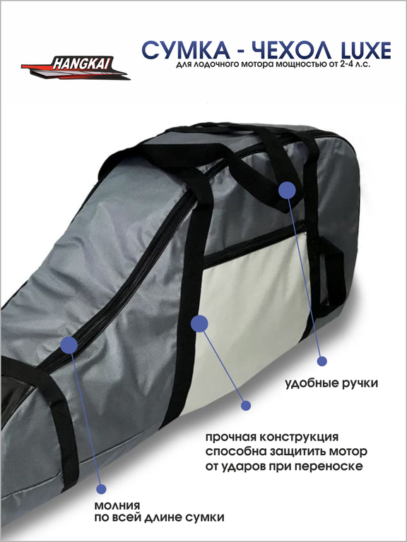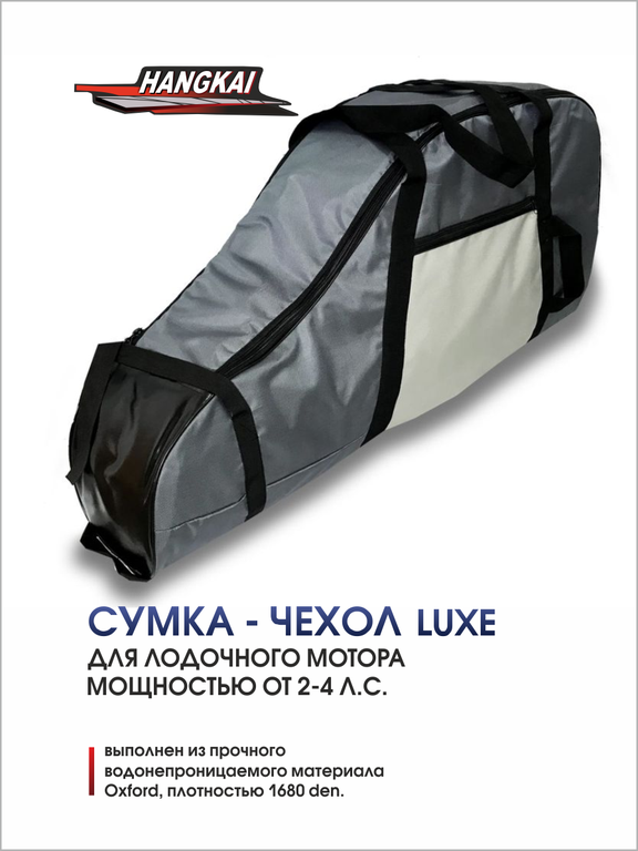 Сумка-чехол Hangkai для хранения и переноски лодочного мотора выполнен из прочного водонепроницаемого материала Oxford, плотностью 1680 den. На боковой стороне имеется карман для хранения инструментов, усиление на винт осуществляется как изнутри, так и снаружи. В производстве используется только качественная фурнитура: усиленная молния, стропа и нить повышенной прочности. Для удобства переноски имеются 2 лямки.
