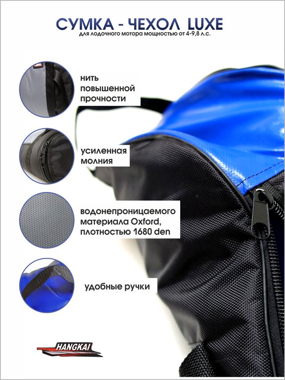 Чехол Hangkai для хранения и переноски лодочного мотора выполнен из прочного водонепроницаемого материала Oxford, плотностью 1680 den. На боковой стороне имеется карман для хранения инструментов, усиление на винт осуществляется как изнутри, так и снаружи. В производстве используется только качественная фурнитура: усиленная молния, стропа и нить повышенной прочности. Для удобства переноски имеются 2 лямки.