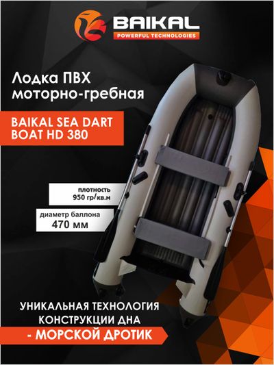 Лодка ПВХ надувная BAIKAL SEA DART BOAT HD 380 – это килевая моторная лодка длиной 3,80 м под мотор до 20 л.с. с надувным дном низкого давления конструкции «Морской дротик».