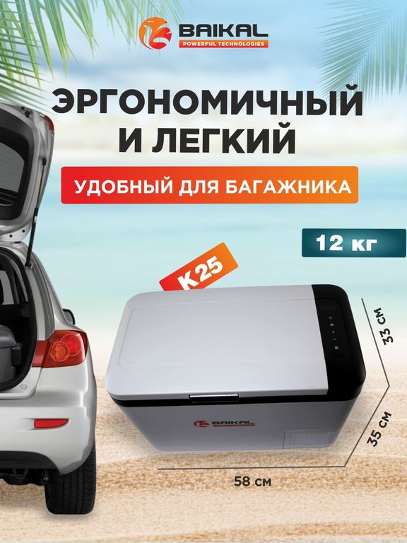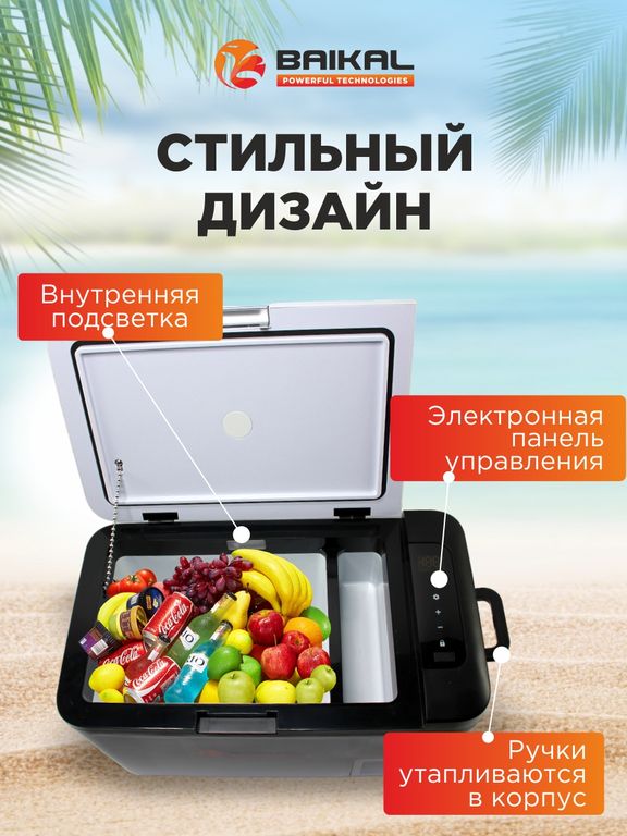 Холодильник BAIKAL K25 выполнен в цветовой гамме препятствующей нагреву корпуса от солнечных лучей, имеет стильный и эстетичный дизайн. Зона охлаждения не большая и функционирует статично за счет основной камеры. Оснащена сенсорным дисплеем управления с возможностью блокировки кнопок.