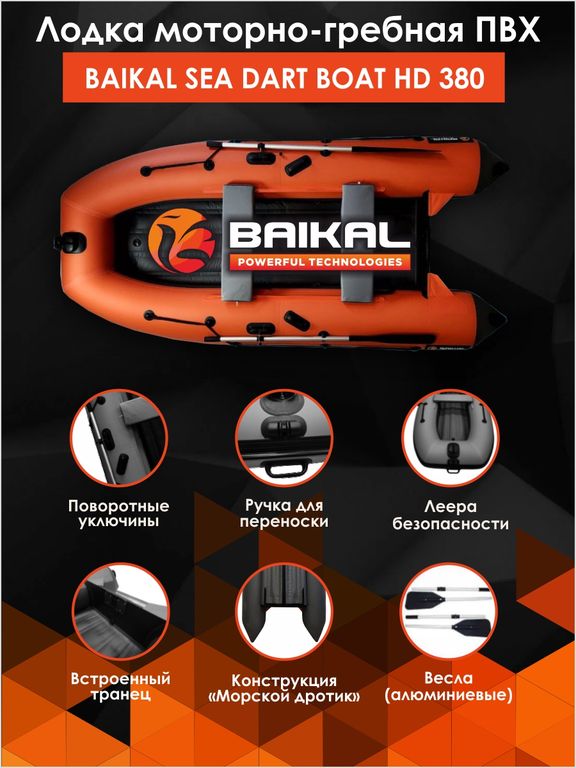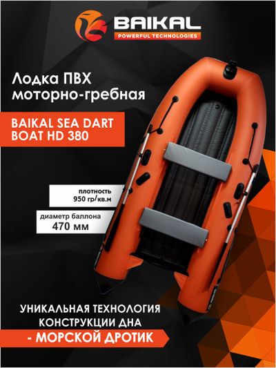 Лодка ПВХ надувная BAIKAL SEA DART BOAT HD 380 – это килевая моторная лодка длиной 3,80 м под мотор до 20 л.с. с надувным дном низкого давления конструкции «Морской дротик».