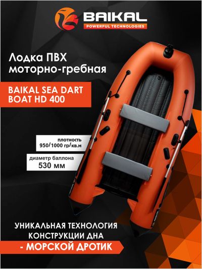 Лодка ПВХ надувная BAIKAL SEA DART BOAT HDS 400 – килевая моторная лодка длиной 4,0 м и шириной 1,5 м под мотор до 30 л.с. с надувным дном низкого давления конструкции «Морской дротик».