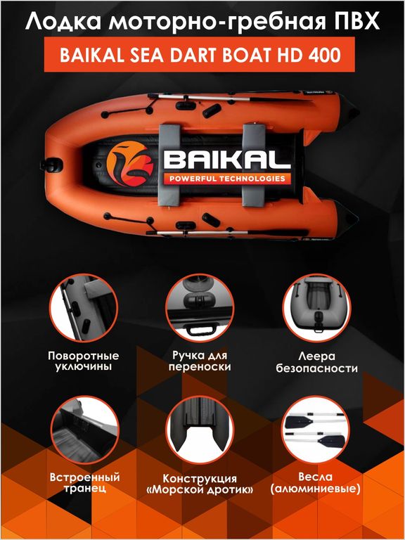 Серия лодок SEA DART BOAT – это одна из последних совместных разработок компаний «Байкал Ханкай» и «Альтаир-Про». Уникальная технология конструкции дна «Морской дротик» HD, установленного по принципу днища лодок с пайолами (выше нижней касательной баллона), и наличие выраженной V-образной килеватости дна, обеспечивает лодкам серии BAIKAL курсовую устойчивость, уверенный и быстрый выход на глиссирование, отличную управляемость и устойчивость, мягкий и чёткий отзыв на поворот румпеля мотора на любой угол при изменении траектории движения.