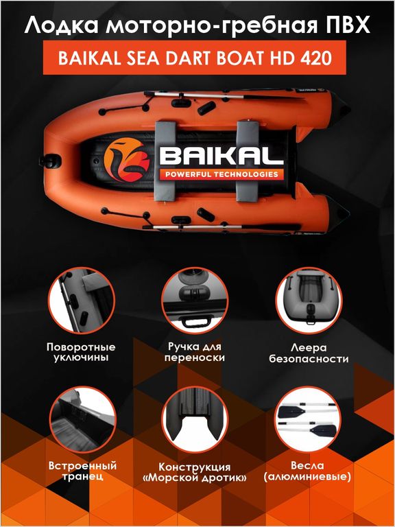Серия лодок SEA DART BOAT – это совместная разработка компаний «Байкал Ханкай» и «Альтаир-Про». Уникальная технология конструкции дна «Морской дротик» HD, установленного по принципу днища лодок с пайолами (выше нижней касательной баллона), и наличие выраженной V-образной килеватости дна, обеспечивает лодкам серии BAIKAL курсовую устойчивость, уверенный и быстрый выход на глиссирование, отличную управляемость и устойчивость, мягкий и чёткий отзыв на поворот румпеля мотора на любой угол при изменении траектории движения.
