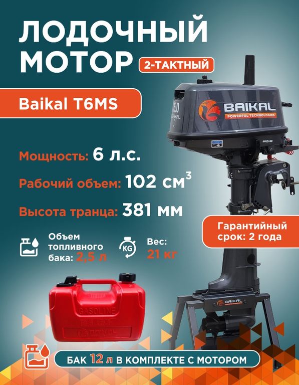 Двухтактный подвесной лодочный мотор BAIKAL 6.0HP изготовлен с использованием японских технологий и имеет простую конструкцию благодаря чему обладает высокой надежностью и простотой в обслуживании. Ручка акселератора находится на румпеле. Очень надежный и экономичный мотор, а по соотношению мощности и расхода топлива обходит многие более дорогие аналоги. Мотор BAIKAL оснащен дополнительным 12-литровым баком, что в сочетании со стандартным 2,5-литровым баком обеспечит особо длительную автономность - от 7 до 14 часов непрерывной работы. Система водяного охлаждения двигателя эффективно справляется со своей задачей, что позволяет поддерживать высокие обороты двигателя в течение длительного времени без риска перегрева мотора.