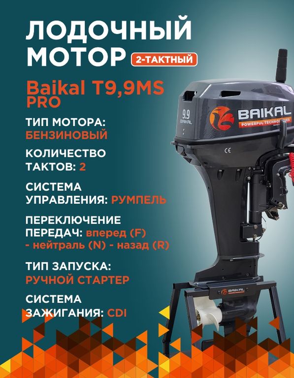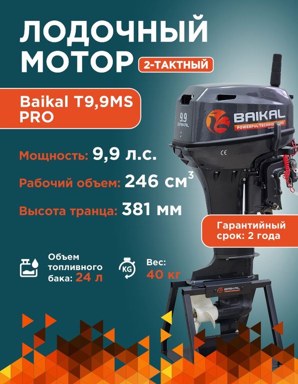 Лодочный мотор BAIKAL 9.9HP PRO — двухтактный подвесной лодочный двигатель мощностью 9,9 л.с. с ручной системой запуска. Рабочий объем двухцилиндрового лодочного мотора — 246 куб.см, масса с винтом — 40 кг. Устанавливается на маломерных судах стандартного транца 381 мм. Рулевое управление осуществляется румпельной рукояткой. Отличается долгим сроком службы, бесперебойной работой и высокой прочностью всех узлов. Отличительная особенность лодочных агрегатов серии PRO – надежность в эксплуатации и возможность использования при любых погодных условиях. В этой модели улучшена система охлаждения, стоит усиленный румпель, а также используется надежная кострукция переключения скоростей. Такие типы моторов устанавливаются на суда для участия в спортивных состязаниях. Серия PRO позволяет не только развивать внушительную скорость, но и сокращает расход топлива.