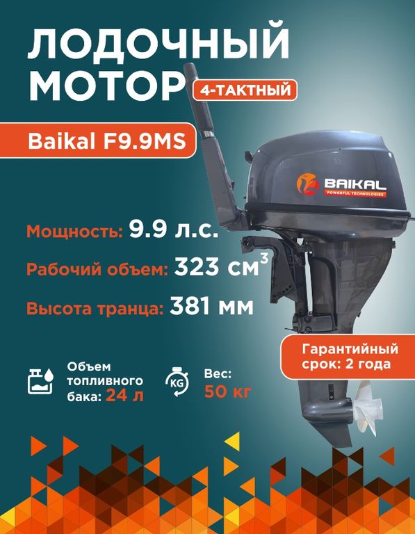 Лодочный мотор BAIKAL F9.9HP с рабочим объемом 323 куб.см способен развивать мощность до 9,9 лошадиных сил. Двухцилиндровый силовой агрегат оборудован выносным топливным баком на 24 литра, а максимальный уровень потребления топлива при этом составляет 3,5 литра в час.