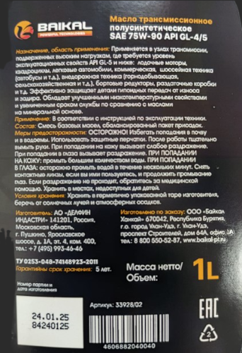 Масло трансмиссионное BAIKAL П/С SAE 75W-90 API GL-4/5